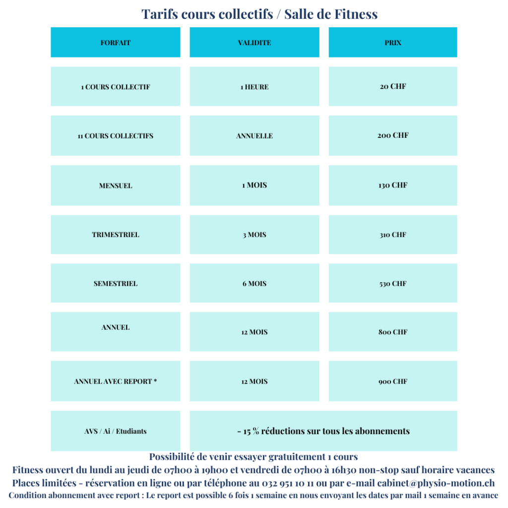 Vous pouvez d’ores et déjà découvrir la liste et les horaires des cours collectifs proposés ainsi que les tarifs.